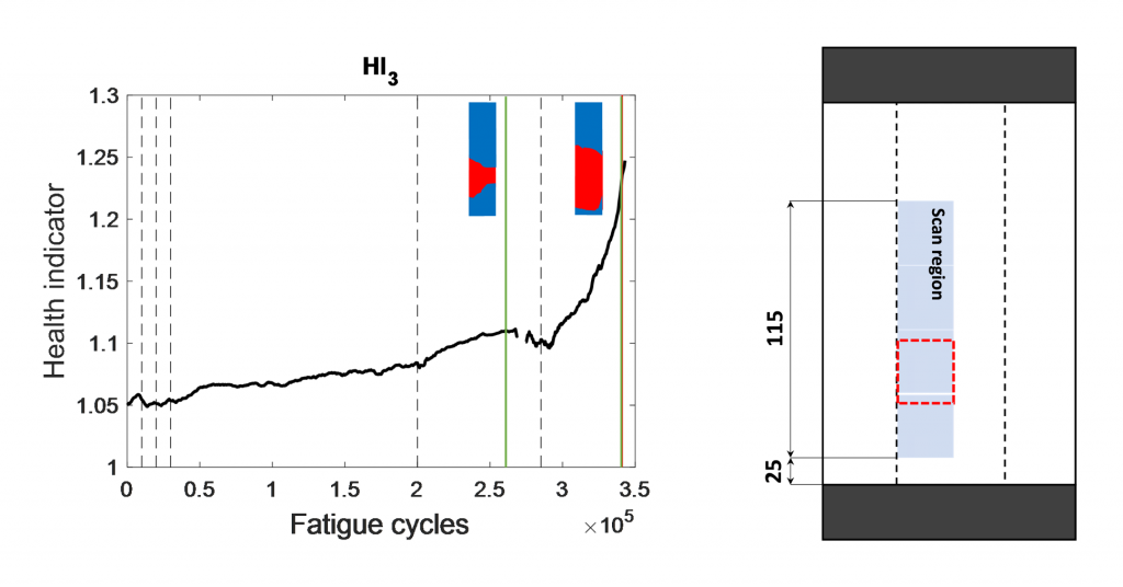 The specimen of the relevant work was imposed to cyclic loading conditions, i.e. compression-compression fatigue spectrum. Strain data are acquired during quasi-static test intervals every 500 fatigue cycles. Gradually, propagation of the nominal disbond was occurred and the behaviour of the indicator was monitored. In-situ non-destructive measurements with a commercial DolphiCam ultrasound camera provided sparing evidence of the actual extend of the delaminated region, as shown below for one pair of sensors.